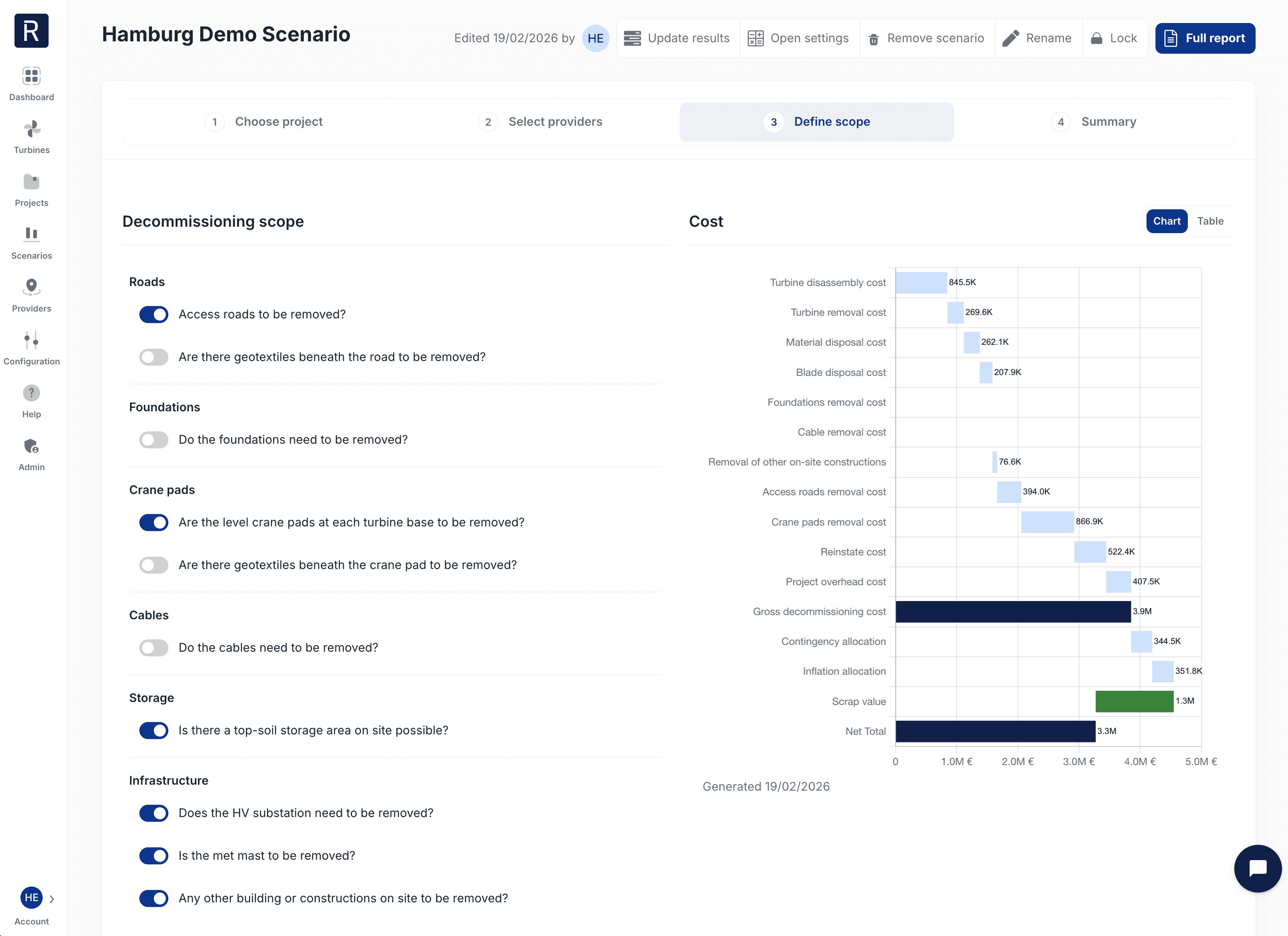 Discover the main drivers of costs for decommissioning your project and what the phases will cosist of, depending on your scenario configuration.